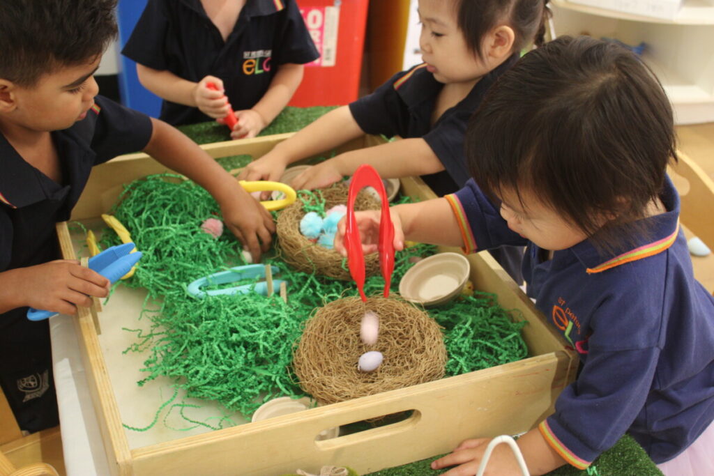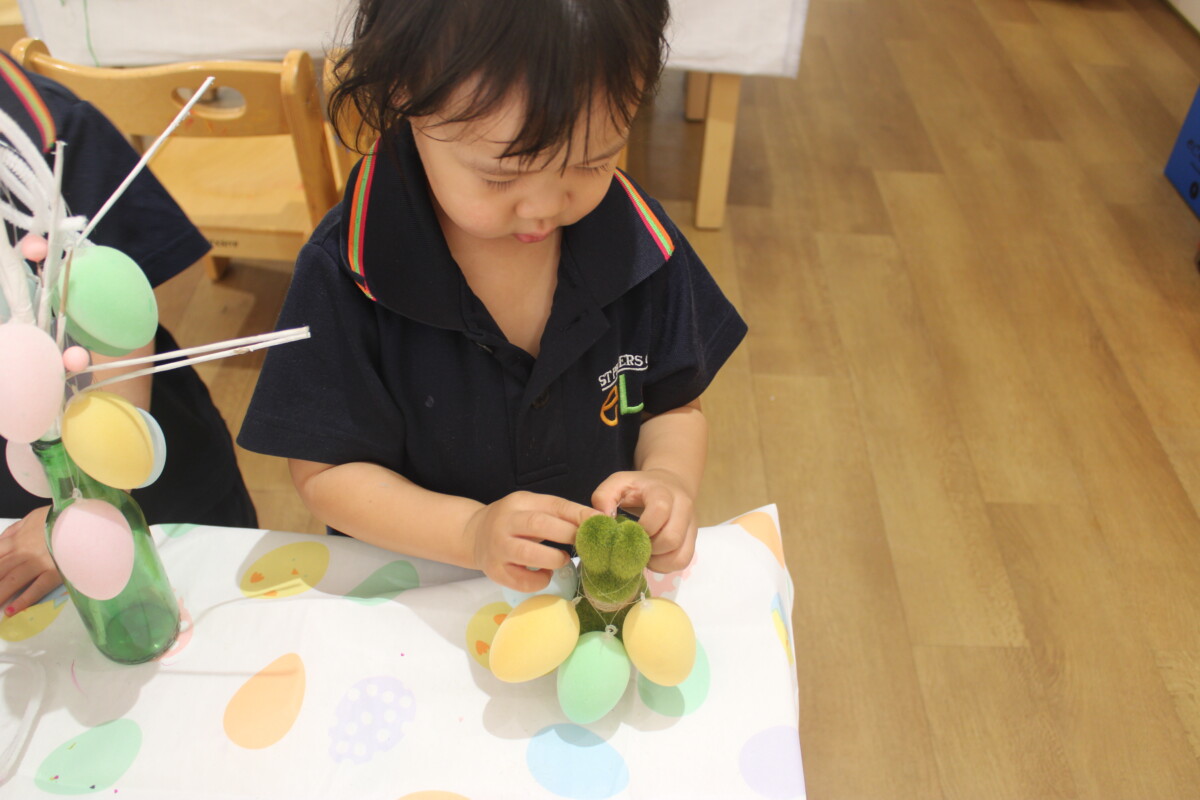 Throughout the Term break, the children also created Easter-themed storybooks, shaped chicks and bunnies from playdough, and explored a sensory loose parts provocation with wooden bunny and egg plates. Each of these experiences gave them opportunities to express themselves symbolically, narrate their world, and deepen their sense of belonging.