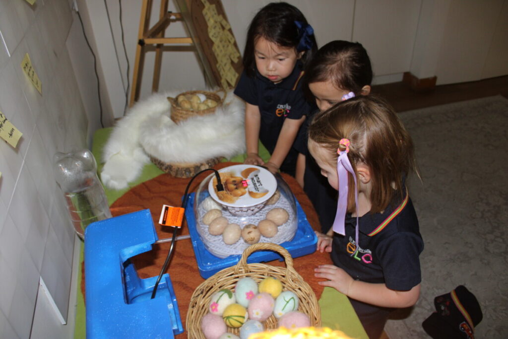 But the true highlight of our Easter experience came from the Erindale room, where a special project was quietly unfolding. For three weeks, a group of eggs sat incubating under careful watch. Children from Learning Community 1 visited them daily, sparking conversations and curious guesses—were they dinosaur eggs? Bird eggs? Maybe crocodiles or even frogs?