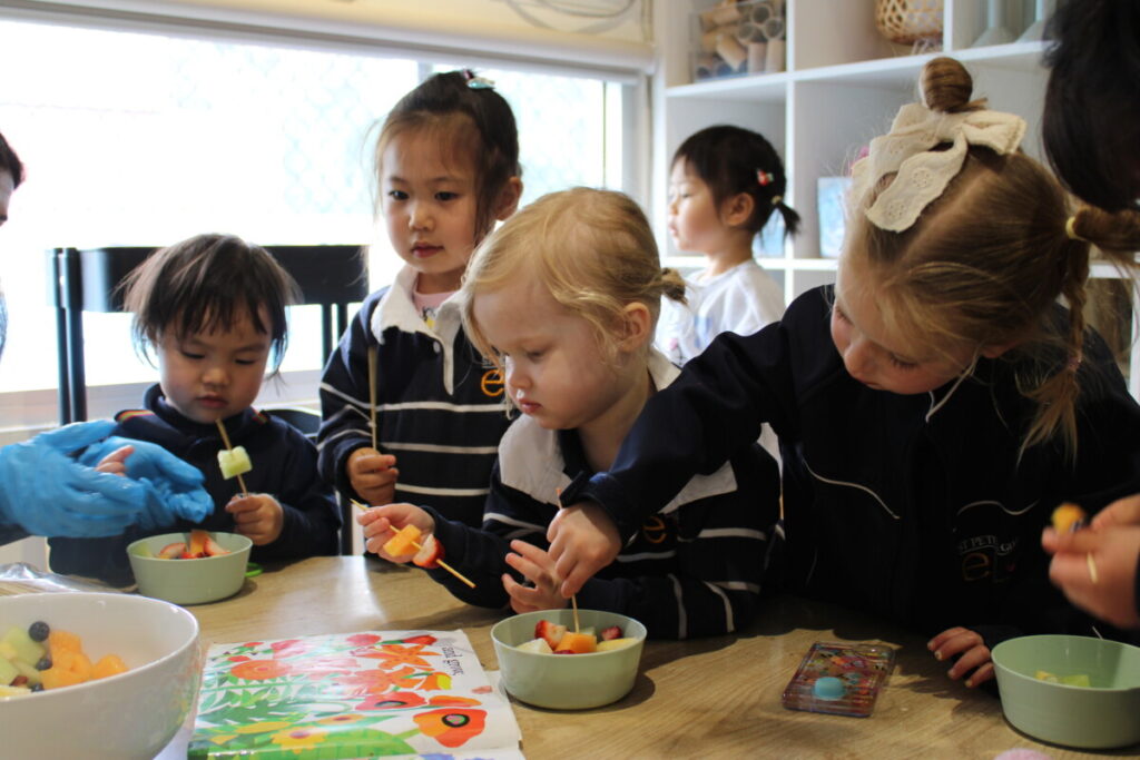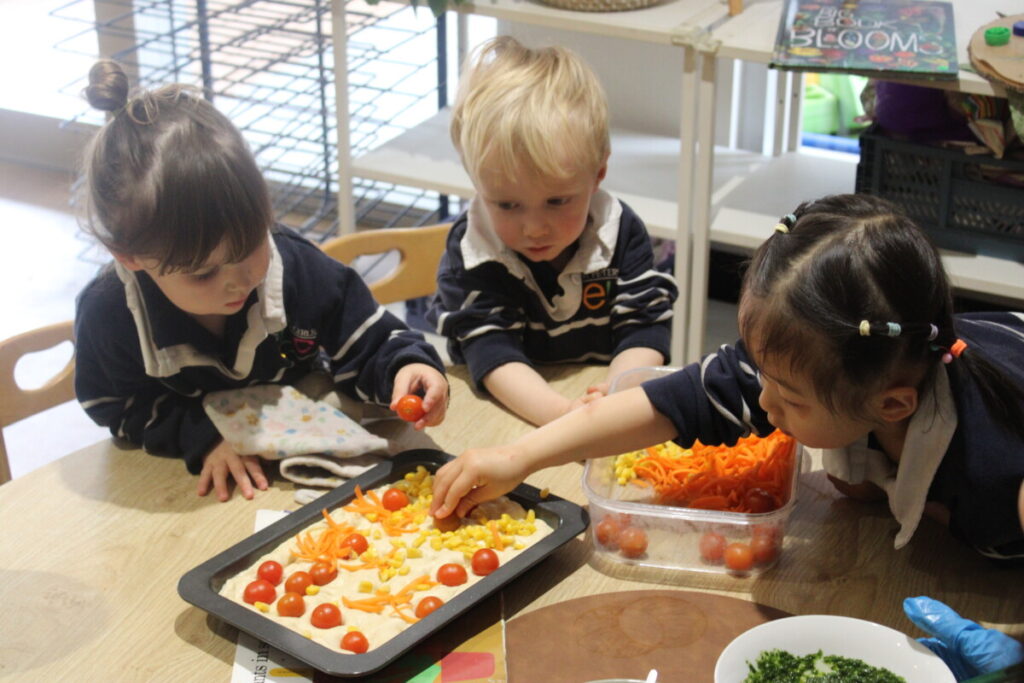 Our ELC Community Garden and shared kitchen experiences played a vital role in exploring the concept of ‘eating a rainbow.’ Children participated in preparing healthy, colourful foods that reflected the diversity of nature’s palette. Activities included assembling fruit skewers and designing focaccia bread with a variety of, vegetables, and herbs. These culinary experiences promoted conversations around nutrition, seasonal produce, and self-care, linking food choices to overall wellbeing.