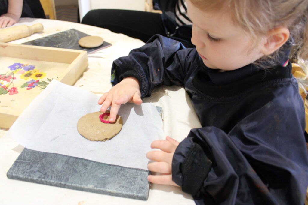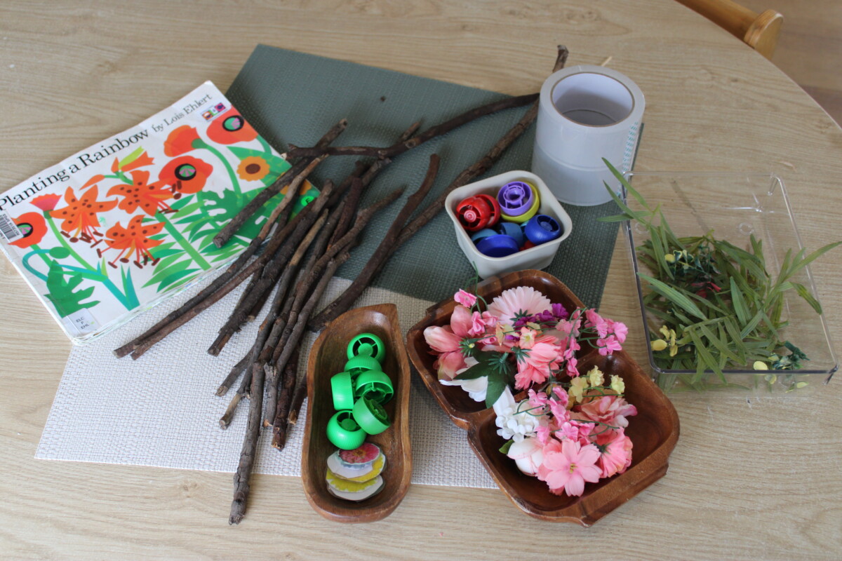 Children were invited to express their interpretations of a rainbow garden through diverse and open-ended activities. Using clay and dried flowers, they constructed three-dimensional garden scenes.