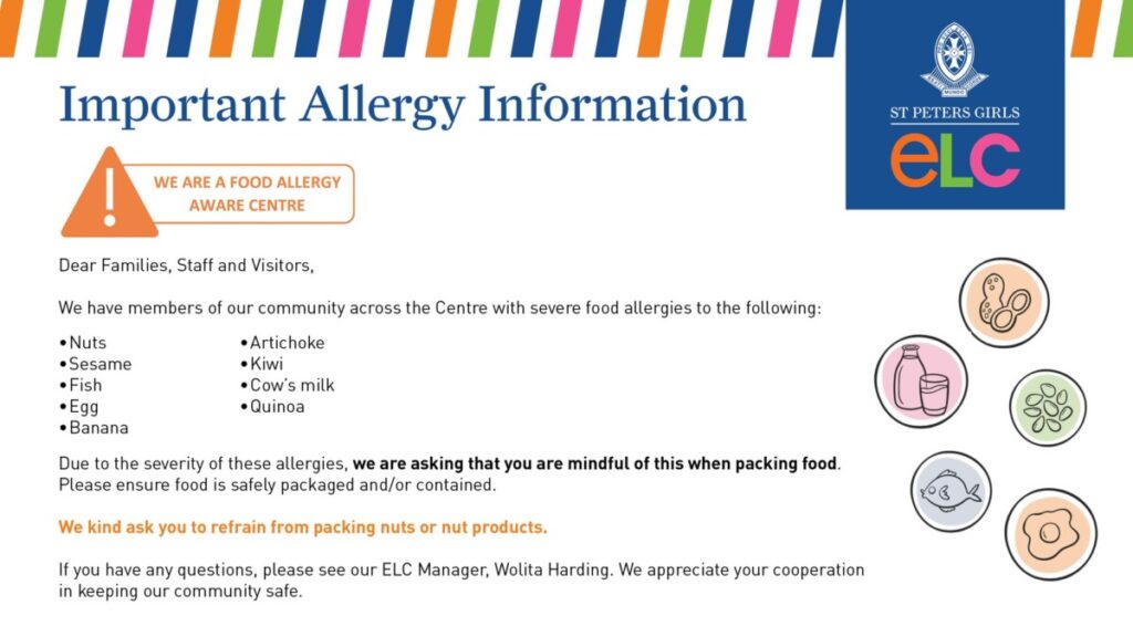 Several of our children live with allergies, and even small traces of certain foods can cause serious reactions. For this reason, we kindly ask that no outside food is brought into the ELC unless previously discussed with your child’s teacher. This includes children carrying food as they arrive in the morning. Our shared responsibility is to maintain a safe environment where every child can feel secure and cared for.