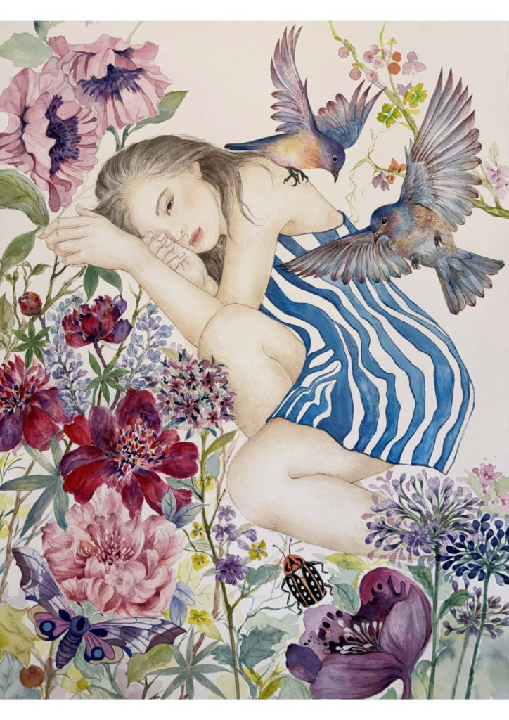 Niki Zheng’s watercolour painting, Identity through Nature, is a meticulously rendered, botanically inspired work that explores themes of identity and connection to the natural world. Through careful observation, delicate technique and layered detail, the piece reflects both technical excellence and personal expression.