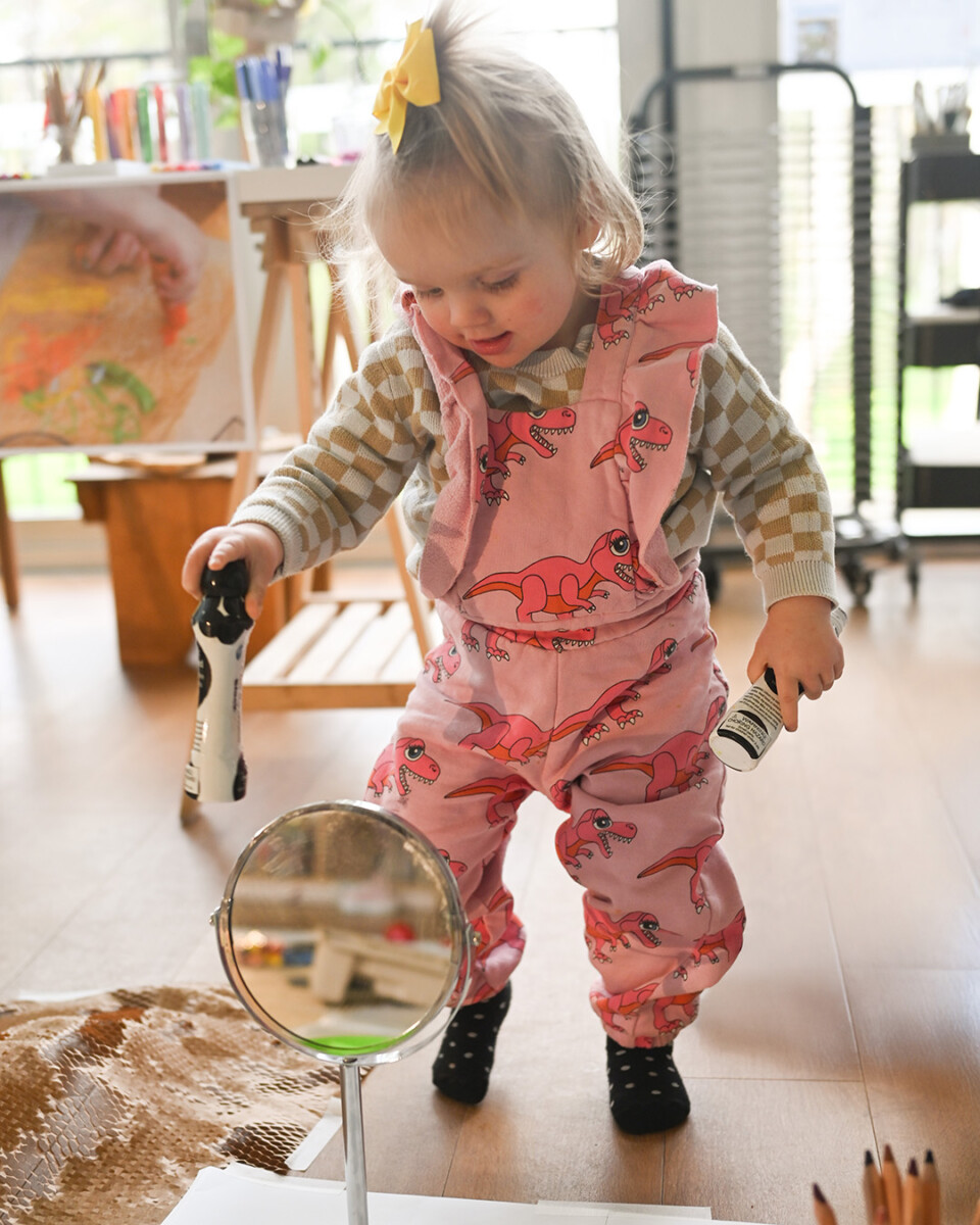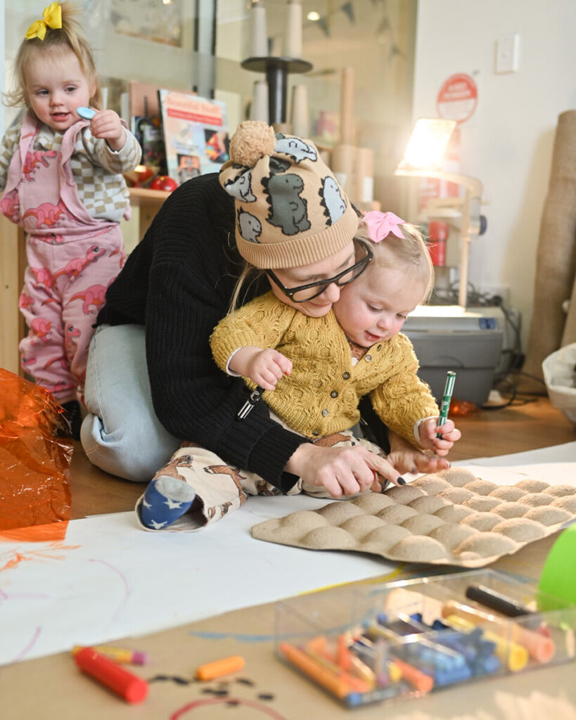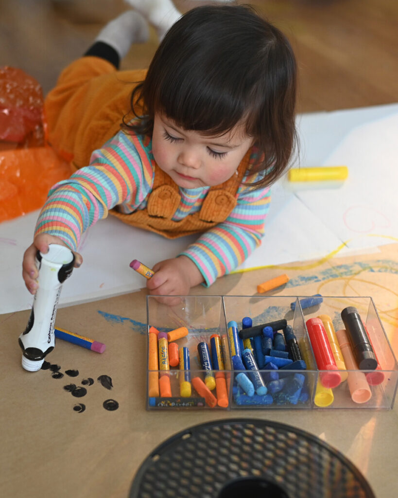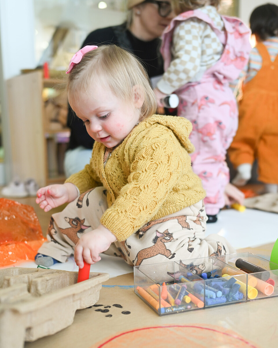 At our ELC Playgroup, children and their families were immersed in a rich sensory experience in the atelier. The space was thoughtfully curated to invite exploration of mark making, with the floor transformed into a canvas of textured papers and a variety of graphic tools.