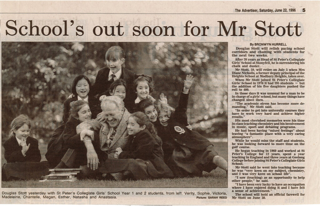 Doug Stott was educated at St Peter’s College, where he served as School Captain in 1954, before completing a Bachelor of Science at Adelaide University. After further studies at Cambridge University and the University of New England, he began his teaching career with a clear philosophy: “I saw teaching as an opportunity to help other people.” Following positions in England and Melbourne, Mr Stott embarked on his remarkable 20 year journey as Principal of St Peter’s Girls’ School in 1976.