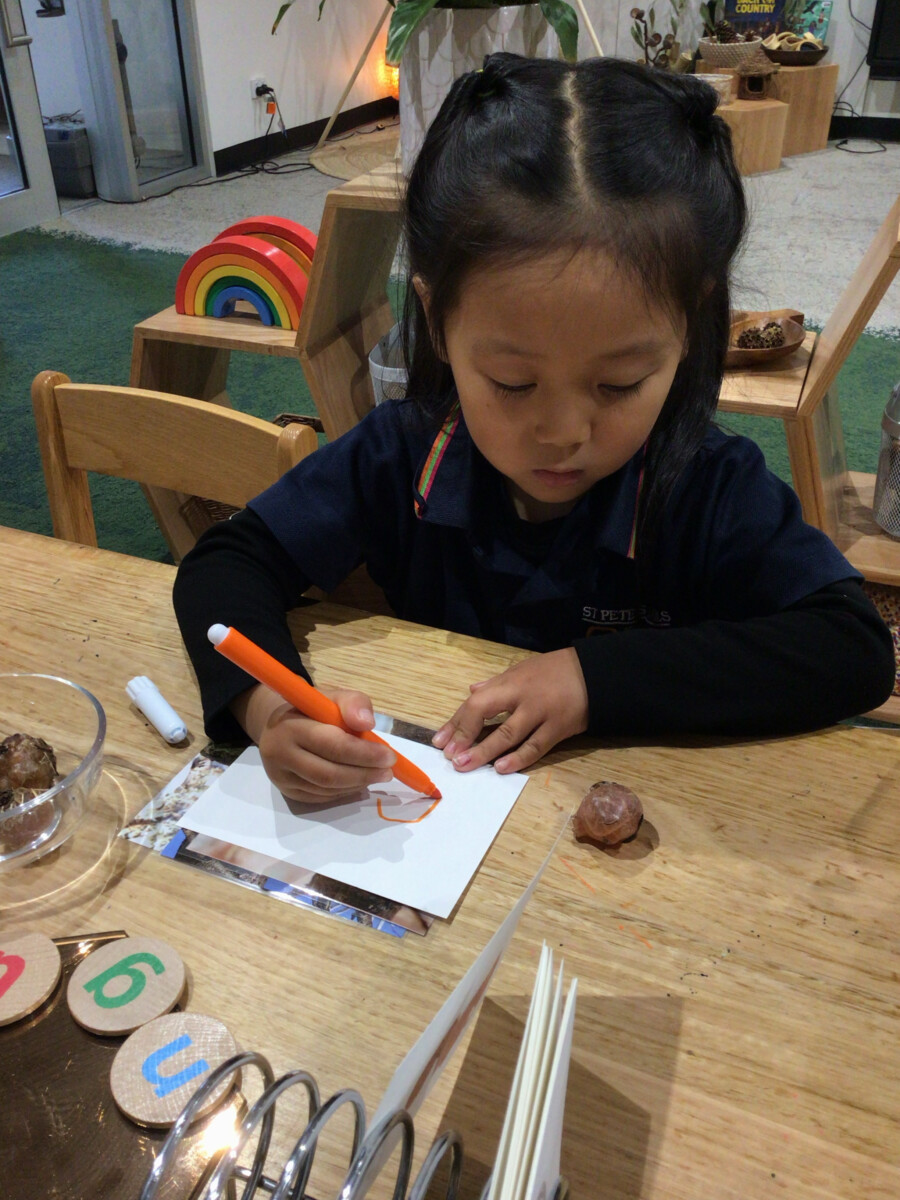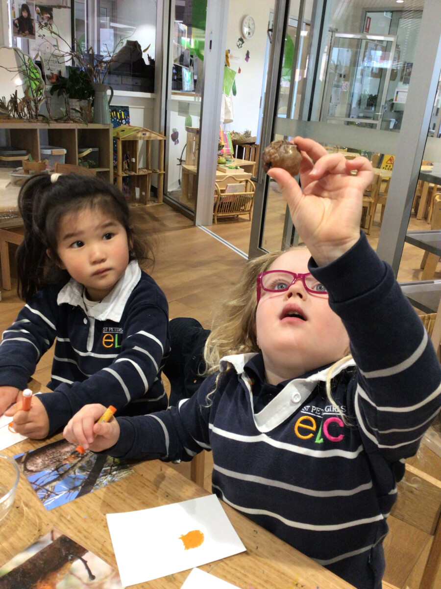 The children have been especially drawn to the array of plant species, the textures and colours of tree trunks, and most especially, the iridescent orange sap found on the bark of the Golden Wattle tree — or, as it is known in Kaurna, ‘Ngum Ngum’. After hands-on opportunities to observe, touch, wonder and discuss the diverse offerings of the Park, the children carefully selected specimens of interest to collect, research and record through graphic language.