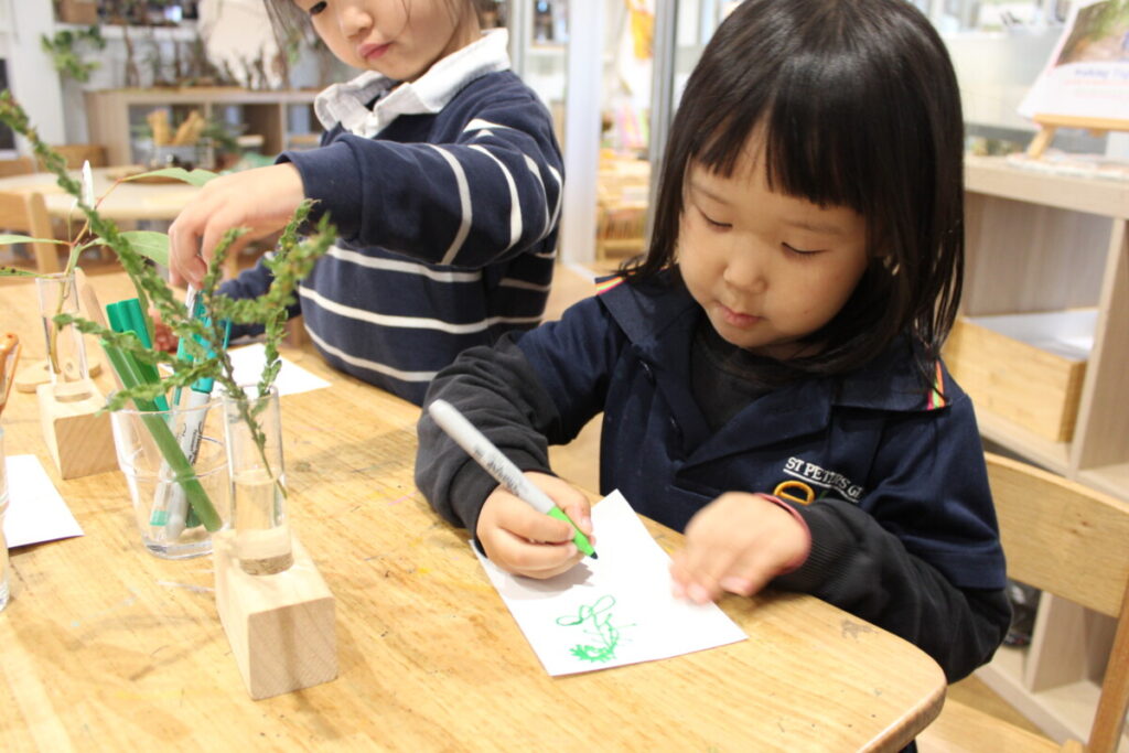 To make their knowledge and understanding visible, our learners delved deeply into the joy of observational drawing. Harnessing their visual discrimination skills, children observed and recorded the finer details of their specimens, including the different shapes of the leaves, the composition of stems, and the various sizes, colours, consistency and opacity of the Ngum Ngum. Here, we observed that the creative process of drawing supported the children to build on their theories and make new discoveries. Many children also challenged themselves to record their findings symbolically, using emerging writing to label their specimens alongside their graphic representations.