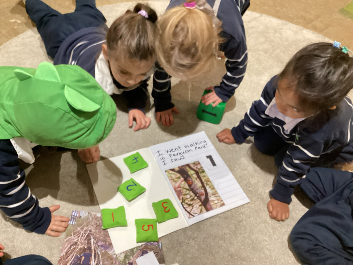 Interacting with children to model and help them verbalise the mathematics happening in their investigations brings awareness to concepts such as sequencing, comparing small amount and representing collections with stories, pictures and numbers.